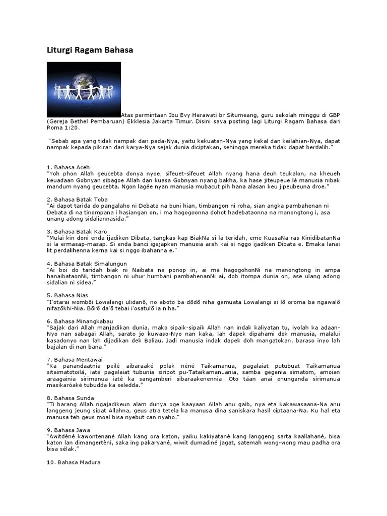 Ibadah minggu pentakosta 1 bahasa batak 31 mei 2020 hkbp jatiasih. Namun dikarenakan keterbatasan kesempatan dan sarana dan pra sarana, menyebabkan si remaja kesulitan untuk menguasai bahasa asing. Liturgi ragam bahasa yoh 3:16. Daftar isi1 tips belajar bahasa batak1.1 contoh penggunaan bahasa batak1.2 kosa kata dalam bahasa batak untuk anggota badan 1.3 kata yang sering diucapkan bahasa batak merupakan bahasa yang mayoritas digunakan oleh orang daerah sumatra utara, orang batak terkenal tegas dan. Metode yang digunakan dalam penelitian ini adalah metode deskriptif penggunaan yang lazim.idiom dalam bahasa batak.